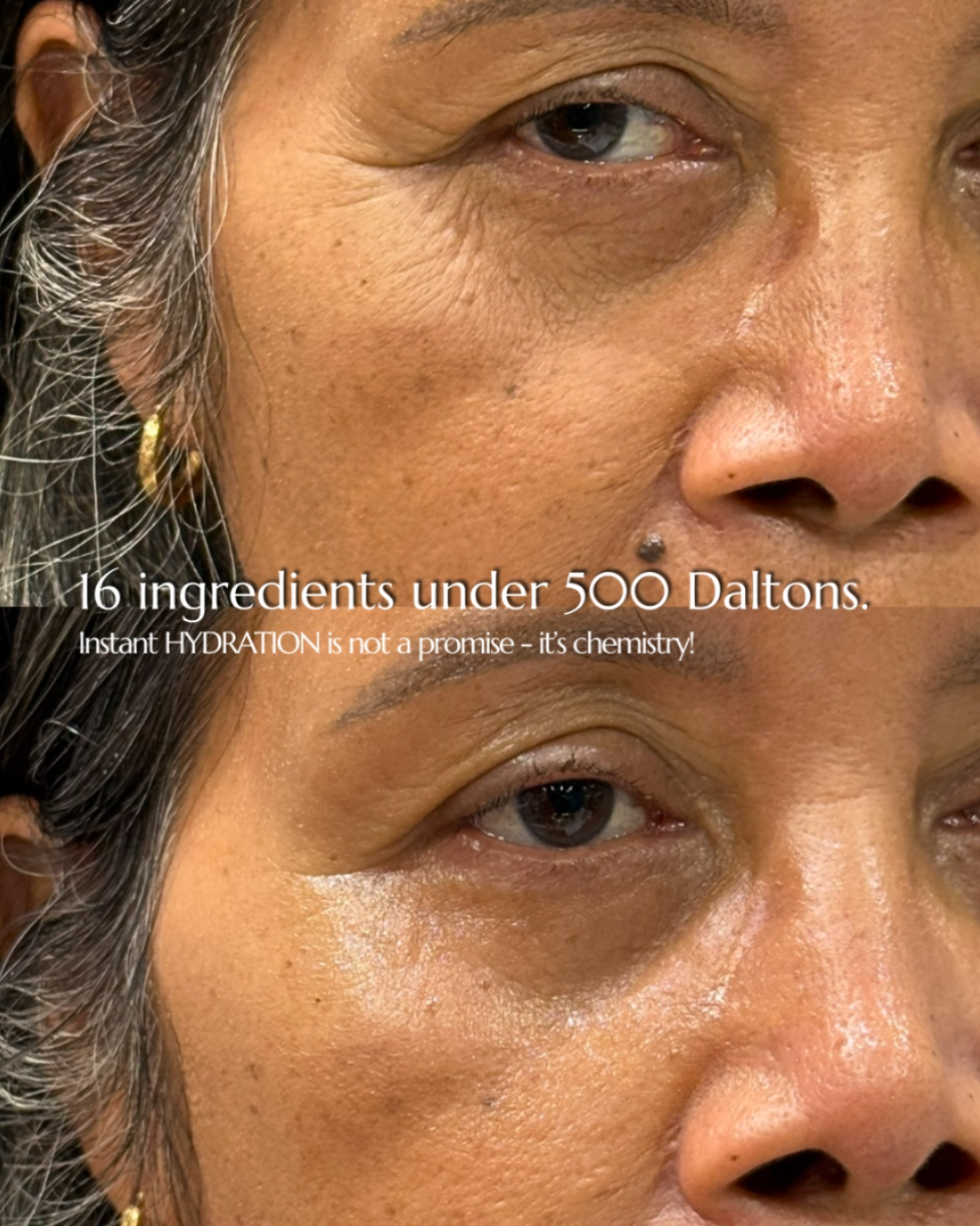16 ingredients below 500 Daltons (low molecular weight) are able to pass through the very top layer of the skin and to where the hydration is needed the most. The result? Visibly plumper skin and smoother looking dehydration lines.